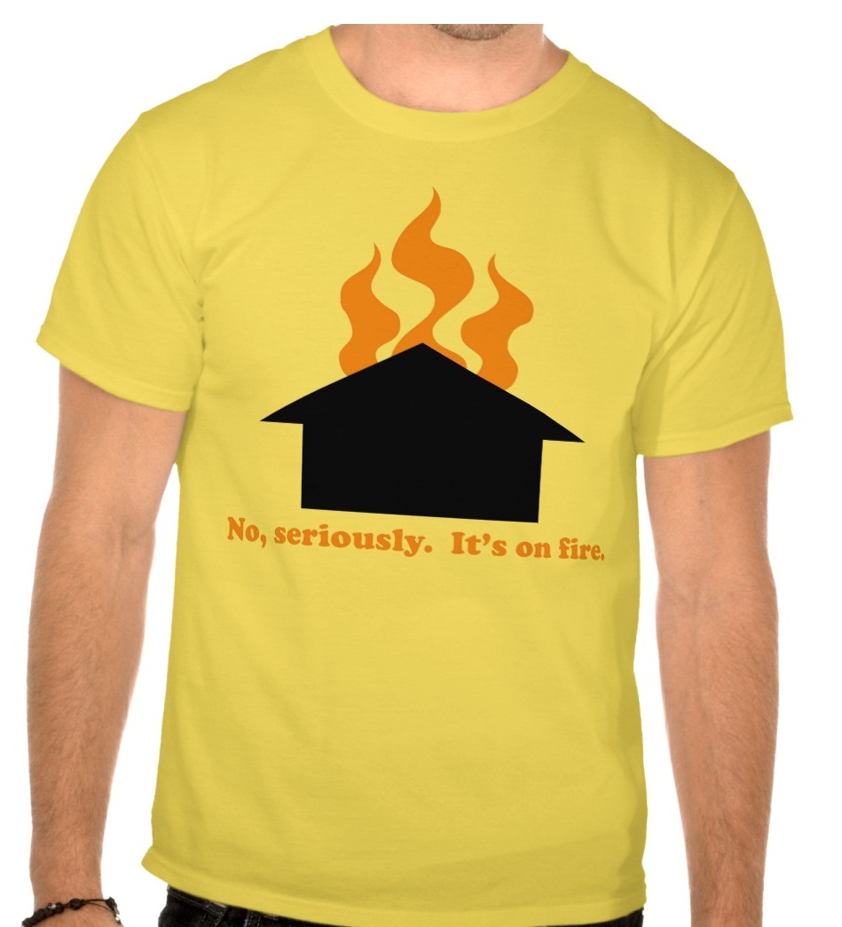 No it's not on fire, in fact it leaks. The roof is in need of repair, but they just don't make a catchy song with those lyrics.